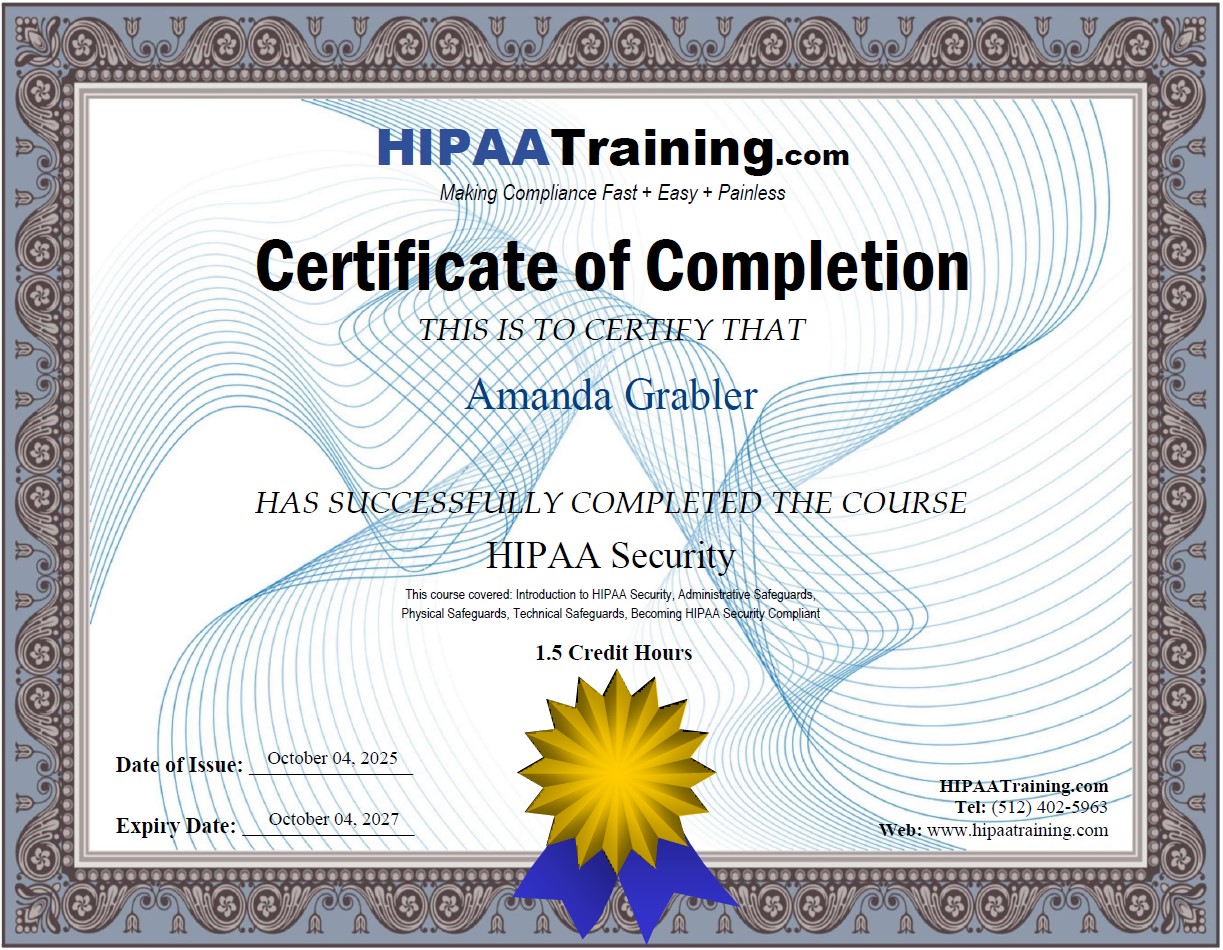 • Successfully completed the course HIPAA Security. This course covered Introduction to HIPAA Security, Administrative Safeguards, Physical Safeguards, Technical Safeguards, and Becoming HIPAA Security Compliant. 1.5 credit hours. HIPAATraining.com